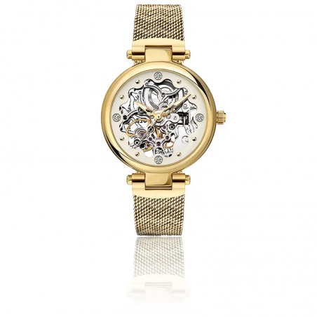 Son boitier de 34mm est couleur or et maintenu par un bracelet en acier offrant une superbe maille milanaise dorée.