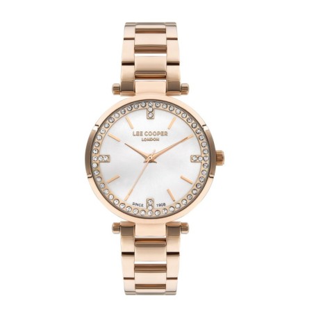Montre Femme Lee Cooper en acier doré rose fond blanc avec oxydes de zirconioum