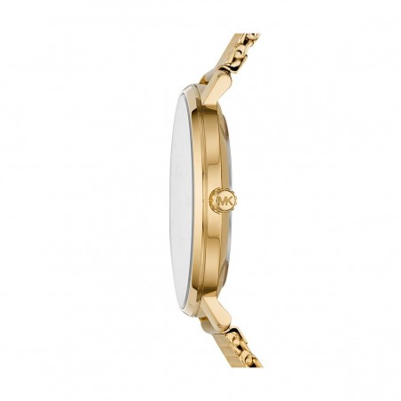 Son bracelet maille milanaise soutient un boîtier rond de 38mm affichant aiguilles et index bâtons dorés.