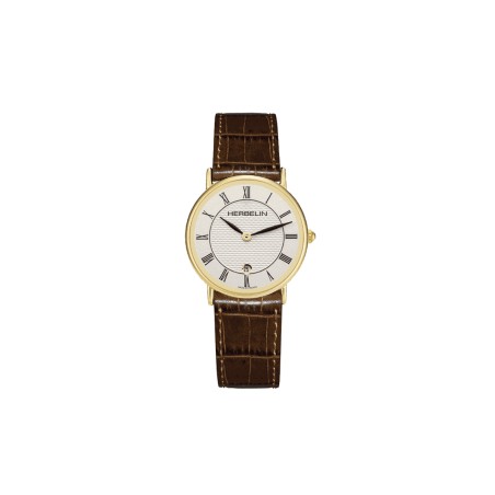 Son bracelet en cuir marron enserre un boitier doré de 26mm. Le cadran blanc affiche un centre en relief et en périphérie, d’une grande finesse, des index chiffres romains et un mécanisme à deux aiguilles.