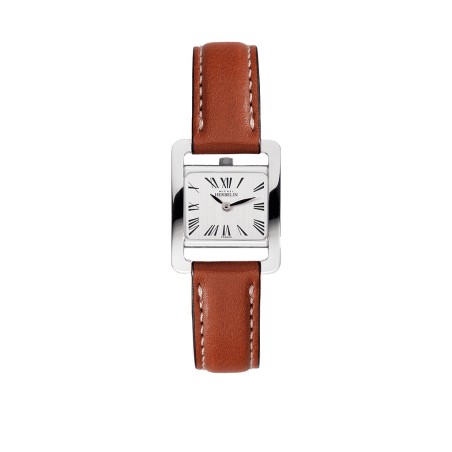 Un bracelet en cuir marron et surpiqûres blanches embrassent un boitier rectangulaire couleur argent.