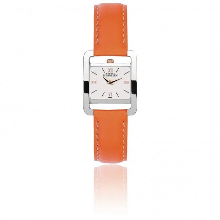 Un bracelet en cuir orange et surpiqûres blanches embrassent un boitier rectangulaire couleur argent.