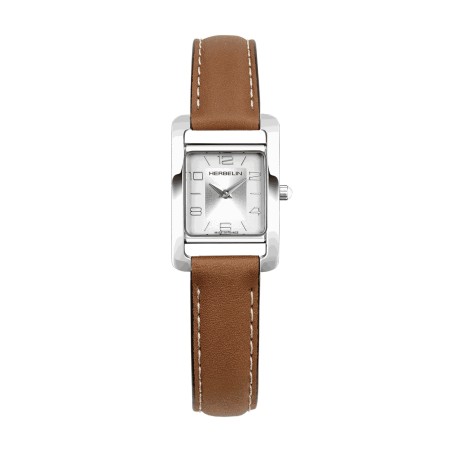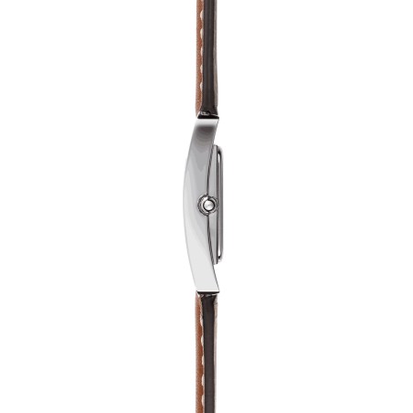 Un bracelet en cuir marron et surpiqûres blanches embrassent un boitier rectangulaire couleur argent.