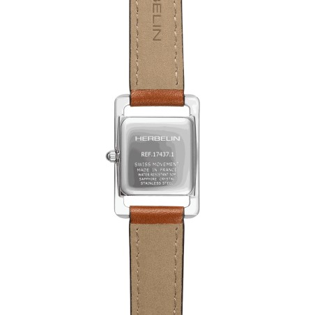 Son cadran carré affiche des index chiffres arabes, ainsi qu’un mécanisme à deux aiguilles.
