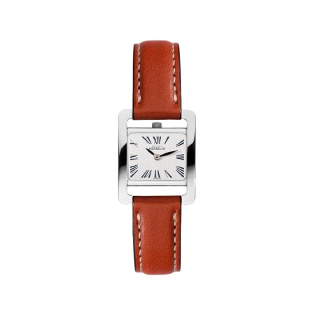 Son cadran carré affiche des index chiffres romains, ainsi qu’un mécanisme à deux aiguilles.