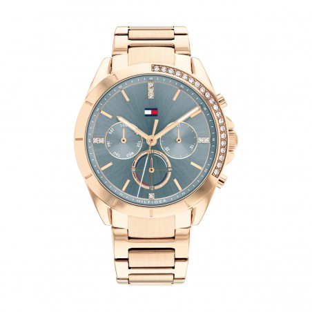 Sur son cadran au nuances de bleu gris des index bâton et un mécanisme à trois aiguilles dorés rose. Une partie de la lunette est incrustée de brillants.