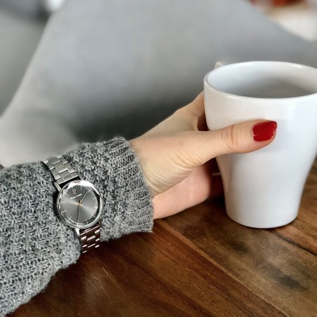 Le boitier est rond en acier de 30 mm et possède un bracelet maille fantaisie couleur argent.