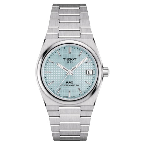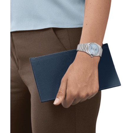 Son boitier gris argent abrite un cadran bleu clair gaufré affichant des index blancs ainsi qu’un mécanisme à trois aiguilles.