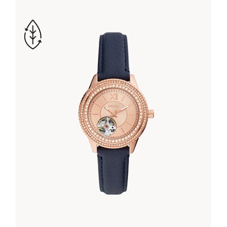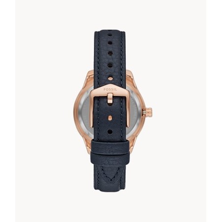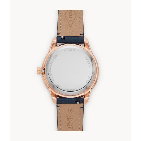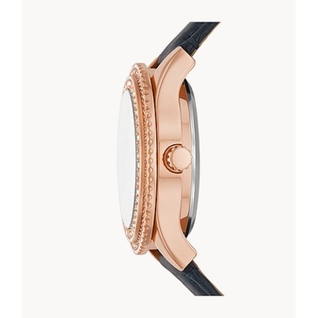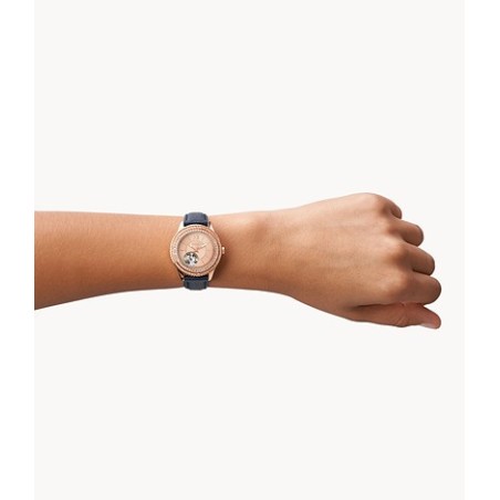 Son boitier de 34mm doré rose sublime son cadran doré rose habillé d'index et d'un mécanisme à trois aiguilles.