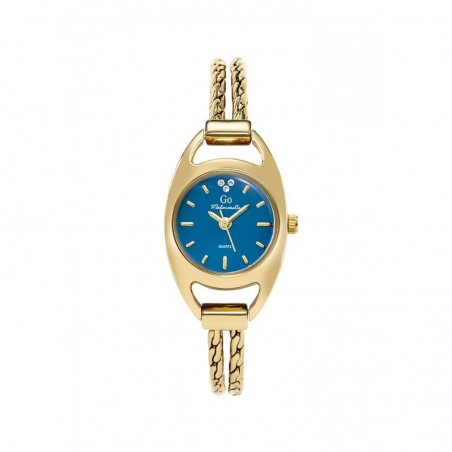 Son bracelet présente une maille de style bijou jonc double dorée. Son cadran rond bleu électrique affiche des index bâton et un mécanisme à trois aiguilles. La marque du logo est présente à midi et à 6h. Trois sublimes brillants se trouvent en lieu et place de l'index 12h.
