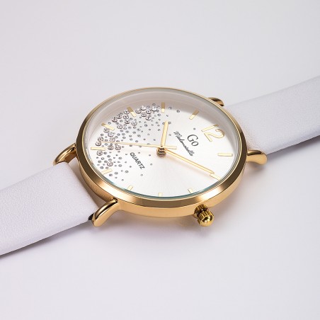 MONTRE GO GIRL ONLY BRACELET CUIR BLANC BOITIER DORE CADRAN ARGENTE AVEC STRASS