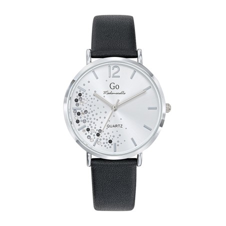 MONTRE GO GIRL ONLY BRACELET CUIR NOIR BOITIER ARGENTE CADRAN ARGENTE AVEC STRASS BLANCS ET NOIRS