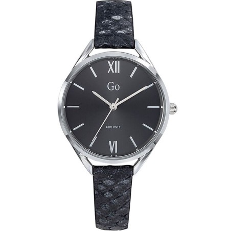 MONTRE GO GIRL ONLY BRACELET CUIR NOIR EFFET PEAU DE SERPENT BOITIER ROND ARGENTE CADRAN NOIR
