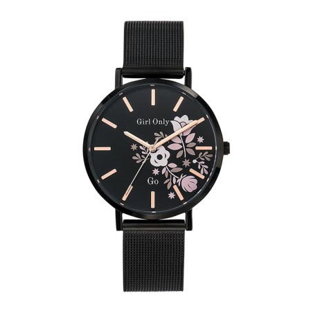 MONTRE GO GIRL ONLY BRACELET NOIR MAILLES MILANAISES CADRAN NOIR ORNE DE FLEURS ROSES