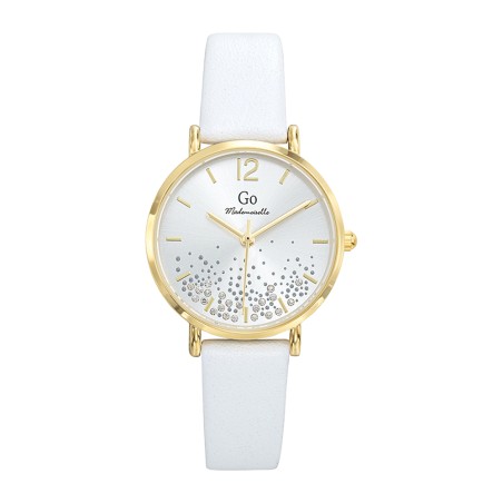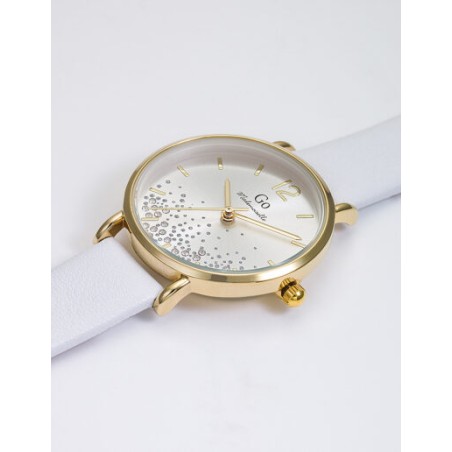 MONTRE GO MADEMOISELLE BRACELET CUIR BLANC BOITIER DORE CADRAN ARGENTE AVEC STRASS