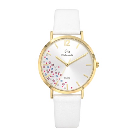 MONTRE GO MADEMOISELLE BRACELET CUIR BLANC BOITIER DORE CADRAN ARGENTE AVEC STRASS MULTICOLORES