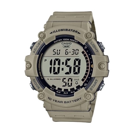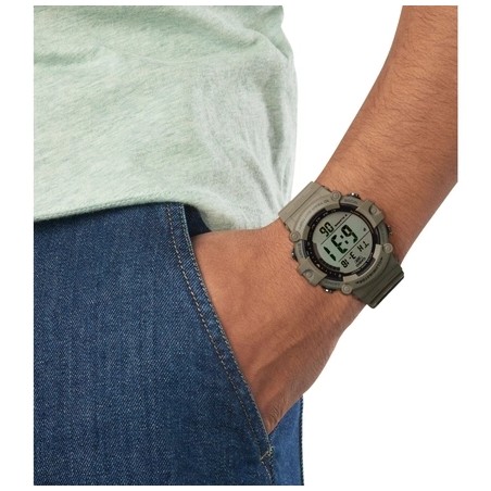 Ce modèle digital est composé d'un boîtier rond et d'un bracelet en résine marron ainsi que d'un écran éclairé par une diode électroluminescente.