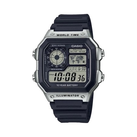 Ce modèle à quartz digital possède un bracelet en résine noir et un boîtier carré en acier ainsi qu'un écran noir éclairé par une diode électroluminescente.