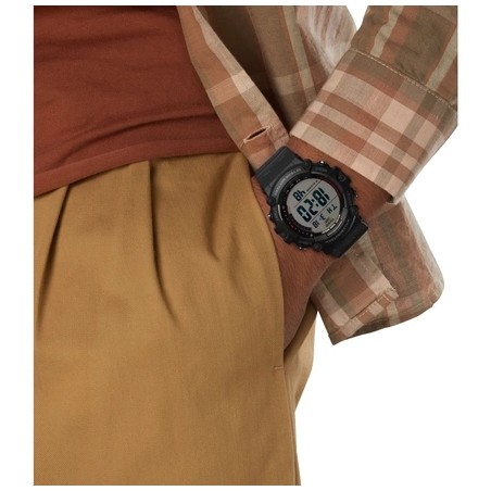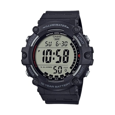 Ce modèle digital possède un boîtier rond et un bracelet en résine noir ainsi que d'un cadran éclairé par une diode électroluminescente.