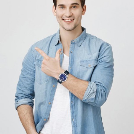 Ce modèle possède un boitier rond de 38mm en acier argenté et un bracelet en cuir bleu.