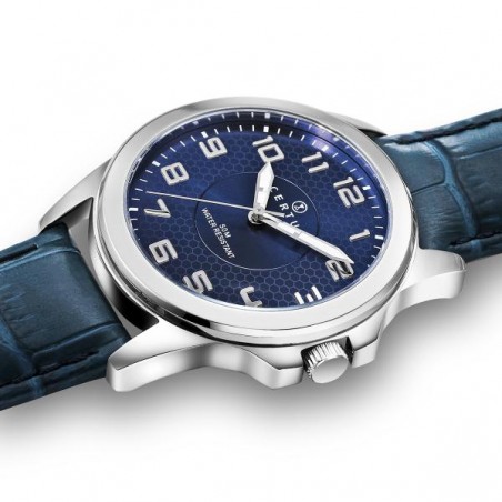 Son cadran bleu met en valeur les aiguilles ainsi que les index blancs bordées d'argentée.