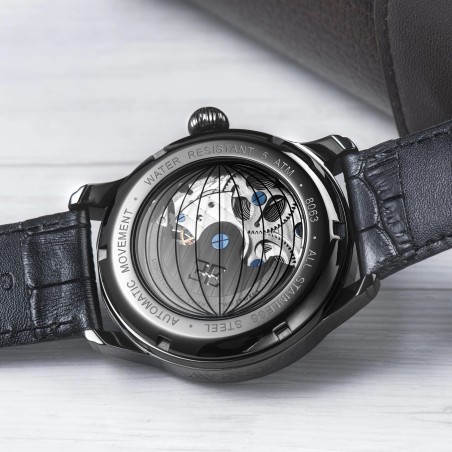 Un liseré noir en circonférence extérieure, une bande blanche contenant des index romains gris et au centre une partie en transparence permettant de voir le mécanisme automatique.