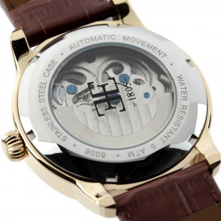 Son bracelet marron enserre un boîtier doré de 44mm. Son cadran ajouré au centre permet la vision de son mécanisme automatique d’une grande finesse.