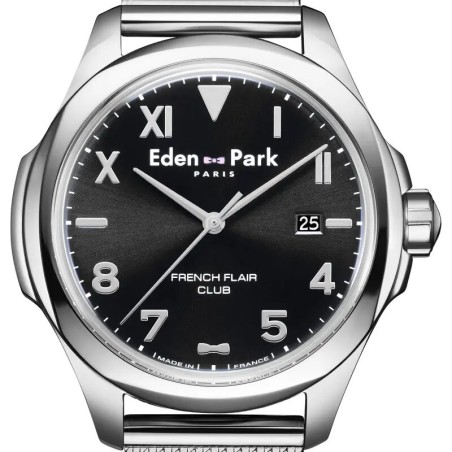 MONTRE HOMME EDEN PARK FRENCH FLAIR CLUB BRACELET MILANAIS ARGENTE CADRAN NOIR DATEUR