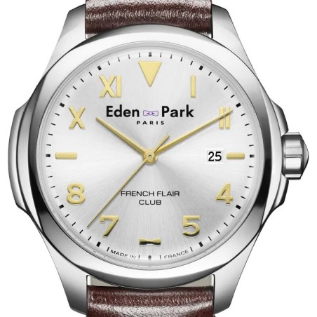 MONTRE HOMME EDEN PARK FRENCH FLAIR CLUB QUARTZ BRACELET CUIR MARRON CADRAN GRIS SOLEIL DATEUR