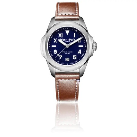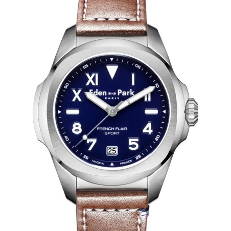MONTRE HOMME EDEN PARK FRENCH FLAIR SPORT BRACELET CUIR MARRON CADRAN BLEU DATEUR