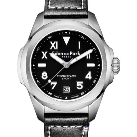 MONTRE HOMME EDEN PARK FRENCH FLAIR SPORT BRACELET CUIR NOIR CADRAN NOIR DATEUR