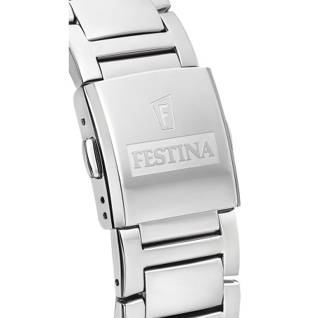 Festina, avec sa montre Timeless chrono, vous propose une montre homme sport très chic. La montre est dotée d'un boitier en acier inoxydable de forme carré, d'un bracelet en acier et d'un cadran bleu. Dimensions du boitier : 37 mm