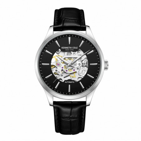 Le cadran noir est ajouré au centre pour permettre la vision du mécanisme automatique interne et abrite des index bâtons ainsi que trois aiguilles délicates.