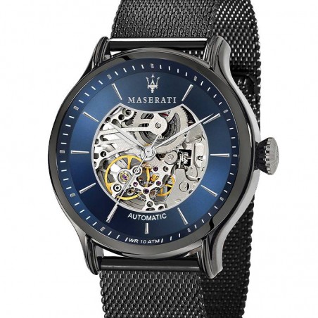 Ce modèle possède un boitier rond noir de 42mm en acier et un bracelet noir en acier maille milanaise.