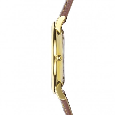 Son bracelet en cuir marron enserre un boitier doré de 38mm. Le cadran blanc affiche un centre en relief et en périphérie, d’une grande finesse, des index chiffres romains et un mécanisme à trois aiguilles.