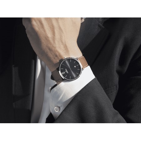 Ce modèle vous séduira par son style chic et sobre. Son bracelet en cuir marron enserre un boitier rond couleur argent brillant.