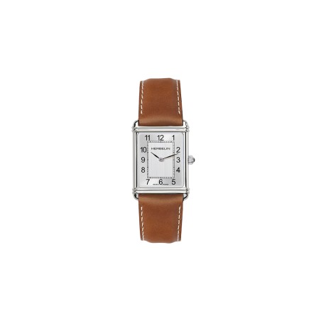 Un bracelet en cuir marron et surpiqûres blanches embrassent un boitier rectangulaire couleur argent.