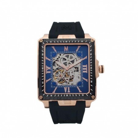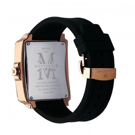Elle possède un boitier carré de 42 mm acier doré rose et un bracelet en silicone noir avec un fermoir à boucle déployant doré rose.