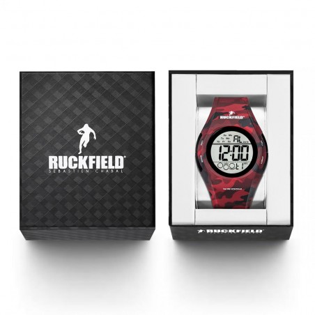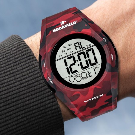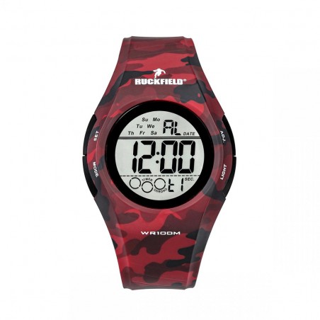 Ce modèle à quartz digital possède un bracelet en silicone rouge et un boîtier en résine rond de 42mm ainsi qu'un écran gris éclairé par une diode électroluminescente.