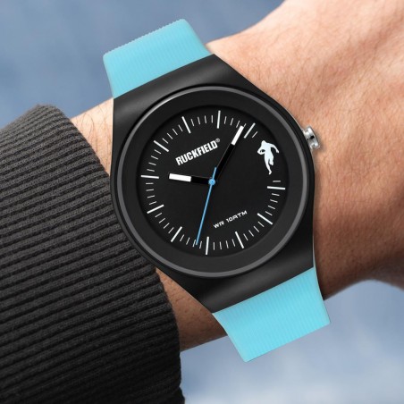 Ce modèle à quartz analogique possède un boîtier rond noir en résine de 40mm et un bracelet en silicone bleu.