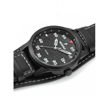 Elle se compose d'un boîtier rond de 43mm en acier et d'un bracelet en cuir noir.