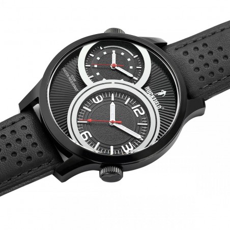 Son cadran noir met en évidence sa fonctionnalité de double fuseau horaire ainsi que les trotteuses de couleur rouge.
