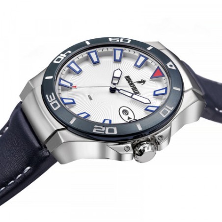 Elle se compose d'un boîtier rond de 45mm en acier argenté et d'un bracelet en cuir bleu foncé.