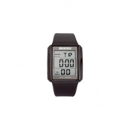Ce modèle à quartz digital se compose d'un boîtier rectangle en résine de 39mm et d'un bracelet en silicone noir ainsi que d'un écran gris éclairé par une diode électroluminescente.