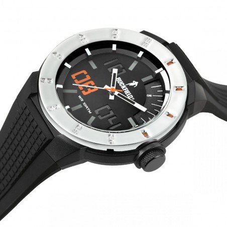 Ce modèle dispose d'un boîtier rond en résine de 49mm et d'un bracelet en silicone de couleur noire.