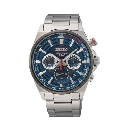 Montre Homme Seiko chronographe bracelet acier cadran bleu nuit et détails rouges
