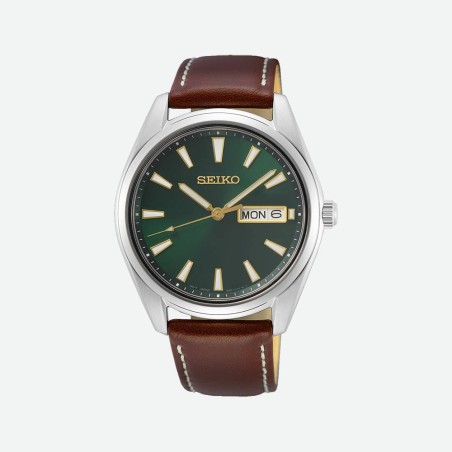 Montre Homme Seiko classique bracelet marron lisse surpiqures blanches cadran vert
