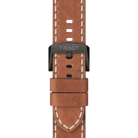Son bracelet est en cuir marron et surpiqures blanches et se referme grâce à une boucle standard.