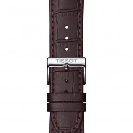 Son boitier de 42mm est en acier rond couleur argent qu’enserre un bracelet en cuir marron embossé façon alligator se refermant grâce à un système de boucle standard.