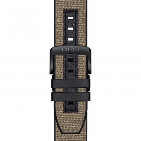 Son bracelet est en caoutchouc noir surmonté de cuir marron et se referme grâce à une boucle standard.